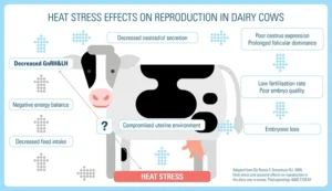 Stres panas pada sapi perah berdampak langsung pada kinerja reproduksinya, yang multifaset dan melibatkan respons fisiologis dan perilaku. Sumbu hipotalamus-hipofisis-ovarium secara langsung dipengaruhi oleh stimulus stres. Setelah terpapar stres, terjadi peningkatan konsentrasi hormon perangsang folikel (FSH) plasma, penurunan produksi estradiol—yang mengganggu durasi dan intensitas estrus—dan penekanan sekresi hormon luteinisasi (LH) [9]. Selama periode stres termal pada sapi perah, penurunan sekresi LH dapat mengganggu pembentukan fungsional korpus luteum [9]. Selain itu, terjadi penurunan kadar progesteron darah. Faktor-faktor ini menunjukkan penurunan viabilitas embrio dan peningkatan mortalitas embrio dini.