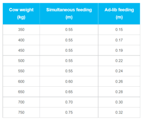 - Semua jalur pejalan kaki/lorong pengikis sapi harus memiliki lebar 2,4 m (2,4 m) dan area makan selebar 4,2 m (3,8 m). Hal ini akan memungkinkan sapi bergerak bebas tanpa risiko cedera atau intimidasi.